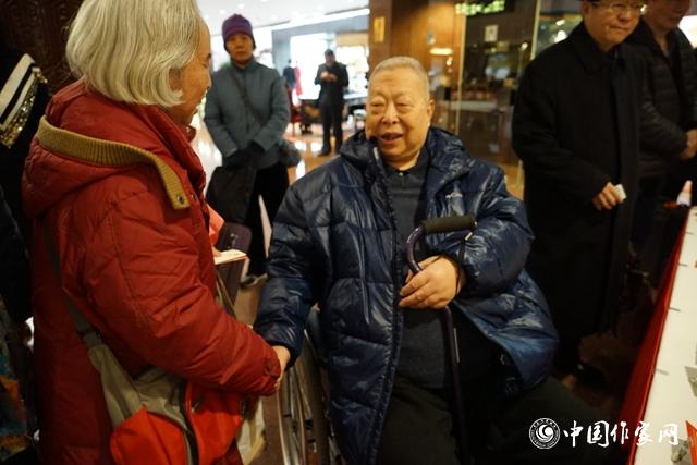 11月29日,中國(guó)作協(xié)第九次全國(guó)代表大會(huì)與會(huì)代表李希凡和張曉風(fēng)見(jiàn)面握手交談。