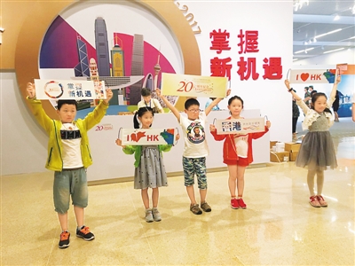 圖為前來參觀的小朋友們在展廳門口與慶祝香港回歸20周年的標(biāo)語合影。
