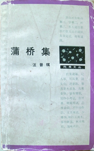他曾對(duì)漓江出版社的《汪曾祺自選集》(1987年10月出版)發(fā)表過一通很妙的議論。他剛拿到此書時(shí),對(duì)送書上門的聶震寧說:“藍(lán)配紫,臭狗屎?!保ù藭饷娴仙鴷小白赃x集”三個(gè)大字卻是綠藍(lán)色的)。聶震寧回說:“臭狗屎就臭狗屎,反正書是好書。”這本書初版本才印了兩千冊(cè),汪先生怕出版社虧本,給家鄉(xiāng)高郵的官員寫信,看家鄉(xiāng)新華書店可否能訂一點(diǎn),以解出版社之憂。僅此小事,也可見出汪先生的善良和善解人意,許多時(shí)候,他總是為別人著想的。我手頭的這本“自選集”,就是購于高郵縣新華書店,時(shí)間是1988年10月。