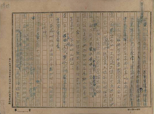 整篇手稿用藍色鋼筆寫在20×20的方格稿紙上,稿紙紙張粗糲,與我們對戰(zhàn)時重慶的物資供給情況的想象一致。整本手稿共計215頁,有修改痕跡。修改明顯可以分成前期和后期兩個階段,以藍色與黑色字跡相區(qū)分。陽翰笙的筆跡稍顯潦草,顯出為創(chuàng)作激情驅(qū)使而奮筆疾書的戰(zhàn)斗狀態(tài)。