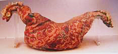 1995年,新疆尉犁縣營盤15號墓出土的一件雞鳴枕,長46厘米、高8厘米,由淡黃色對禽對獸紋綺縫制而成,兩端下垂呈雞頭造型。枕面上用七色絲線,以鎖繡法繡滿蔓草紋樣;枕頭兩端各縫綴四瓣花葉狀紅色絹飾,末端縫綴黃色穗;枕芯是小米。這件雞鳴枕出土?xí)r,放置在一位深目高鼻的男子腦后,男子身著對人對獸對樹罽袍,罽袍上的男子手持矛、盾、劍等武器作揮舞狀,具有典型的古希臘古羅馬風(fēng)格。