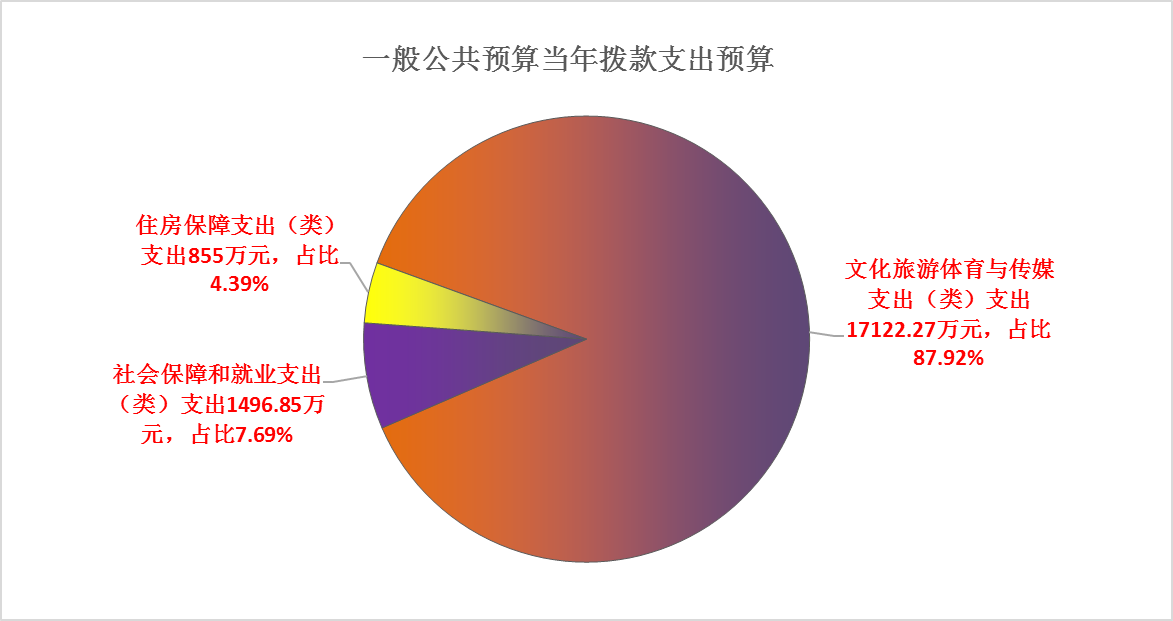文化旅游體育與傳媒支出(類)支出17122.27萬元,占比87.92%;社會保障和就業(yè)支出(類)支出1496.85萬元,占比7.69%;住房保障支出(類)支出855萬元,占比4.39%。