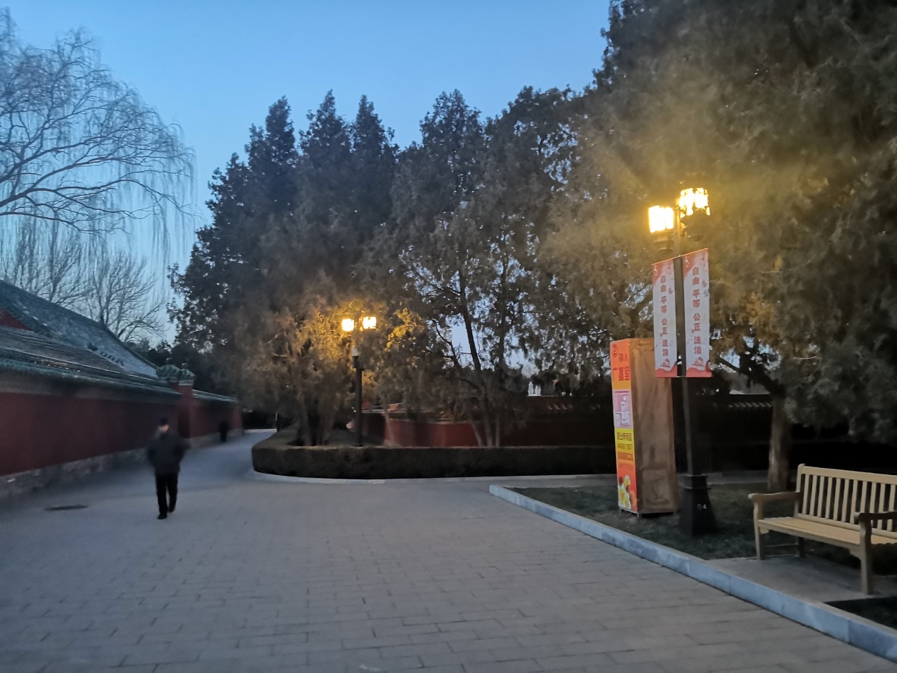 聽(tīng)完朗誦會(huì),我突然意識(shí)到自己從未去過(guò)地壇,看天色還早,便搭車(chē)前去。地壇公園面積不大,用腳步衡量很快就會(huì)走完,但在松柏常翠的安靜里用心體會(huì),又覺(jué)得忽然間進(jìn)入了一個(gè)無(wú)垠的空間。離開(kāi)時(shí)明月已上樹(shù)梢,看著門(mén)外的車(chē)水馬龍和門(mén)內(nèi)逡巡的小鳥(niǎo),真切地感受到史鐵生先生所說(shuō),“在人口密集的城市里,有這樣一個(gè)寧?kù)o的去處,像是上帝的苦心安排?!?(上圖即2020年1月4日傍晚的地壇公園。 陳澤宇 攝)