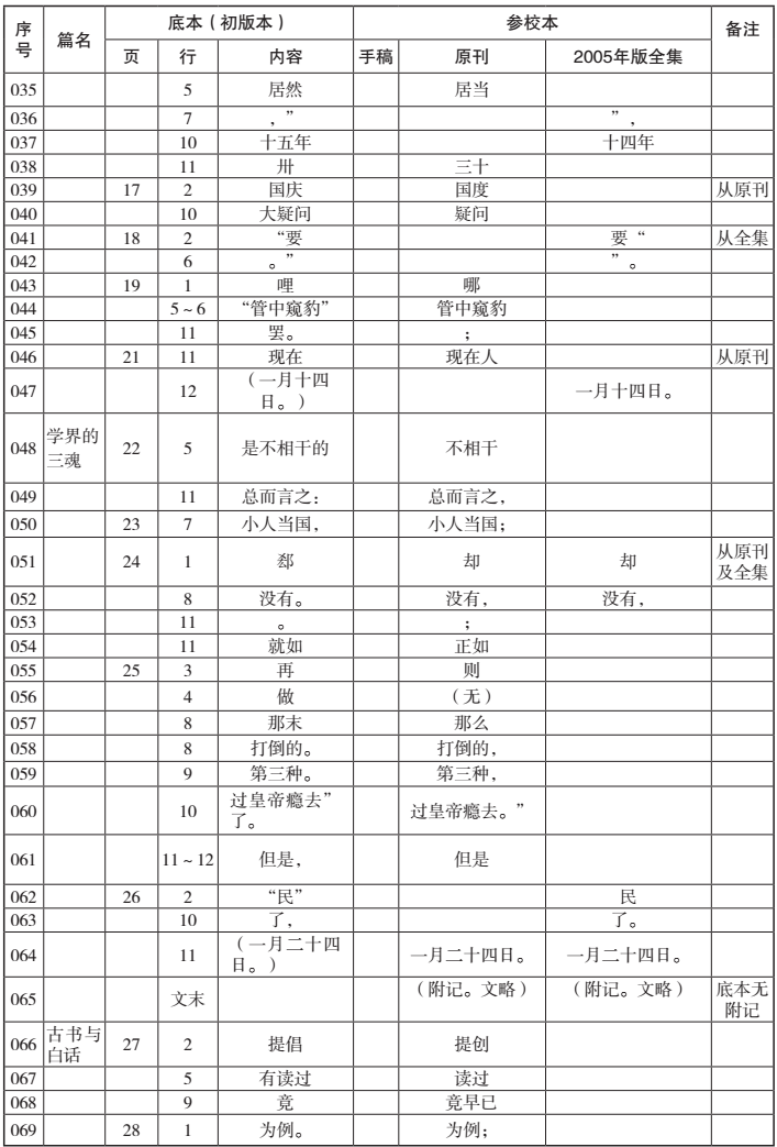 在決定專心從事此項匯校工作之后,因為用于匯校的底本(影印本)、手稿(影印本)與全集筆者早已收藏,因此在資料方面只余下原刊的搜求匯集。得益于近年來舊書刊被大規(guī)模掃描和收入網(wǎng)絡(luò)數(shù)據(jù)庫的利好以及學(xué)友的幫助,這項工作在短短幾天內(nèi)即基本完成。[vii]接下來在進行具體匯校時,為了讓自己沉下心來,全神貫注,我決定先不參考任何前賢成果,空無依傍,對文本進行“素讀”,以保證能最大限度地發(fā)現(xiàn)各版的差異之處。由于手稿嚴(yán)重不全,全集差錯很少,因此我把重點放在原刊和初版本的對勘上,逐字逐句進行。在對勘過程中發(fā)現(xiàn)兩者有任何差異,無論是文字還是標(biāo)點,都及時記錄并填入?yún)R校表中。將原刊和初版本對勘完成后,再按同樣的程序,將初版本和全集進行對勘。此后,再將手稿和初版本進行對勘。當(dāng)然,這只是工作的一般程序。實際過程中,遇有疑難處,需要各版互校,也常出現(xiàn)將所有版本擺滿案頭的情形。