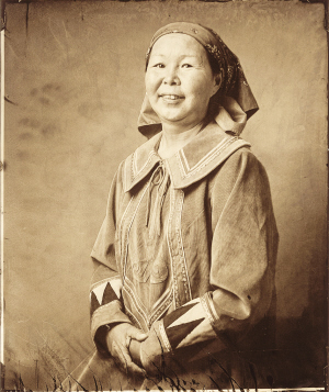 在長(zhǎng)時(shí)間的考察和相處中,筆者與使鹿鄂溫克人建立了良好的相互信任的關(guān)系,因此,即使笨重的大畫(huà)幅相機(jī)擺在他們面前,他們的狀態(tài)還是很放松。被拍攝人物身著使鹿鄂溫克人的傳統(tǒng)服飾,選擇他們?cè)谏钌矫芰种芯幼〉摹按榱_子”或帳篷作為拍攝地點(diǎn),在被攝者住所內(nèi)部搭建簡(jiǎn)易影棚,統(tǒng)一拍攝光源與背景。