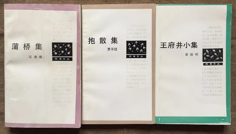 八十年代末到九十年代初,有幾套小開本值得一提:一是作家出版社的“四季文叢”,一套作家隨筆集。這套作為叢書,比較松散,扉頁、勒口或封底并沒有注明相關(guān)信息,用今天的標(biāo)準(zhǔn)來看,其實是難達標(biāo)的。據(jù)我所知,應(yīng)該出了四種,分別為汪曾祺的《蒲橋集》、賈平凹的《報散集》、姜德明的《王府井小集》和張承志的《綠風(fēng)土》,我收了前三種。素?zé)o記書帳習(xí)慣的我,惟那個時期,買書時會在扉頁上簽名,所以知道三本分別購于和平里書亭和海淀圖書城。這套書除了選文比較精當(dāng)(體現(xiàn)了作家社的專業(yè)標(biāo)準(zhǔn))之外,最大特點是質(zhì)樸大方,沒什么花里胡哨花的元素:封面近乎素白,書脊設(shè)計很鮮明,即使豎插在書架中,也不至于看漏。用紙雖不高級,但在那個時代也并不寒磣。