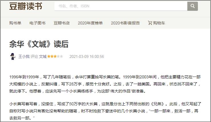豆瓣用戶王小我對(duì)《文城》發(fā)表的評(píng)論(節(jié)選)