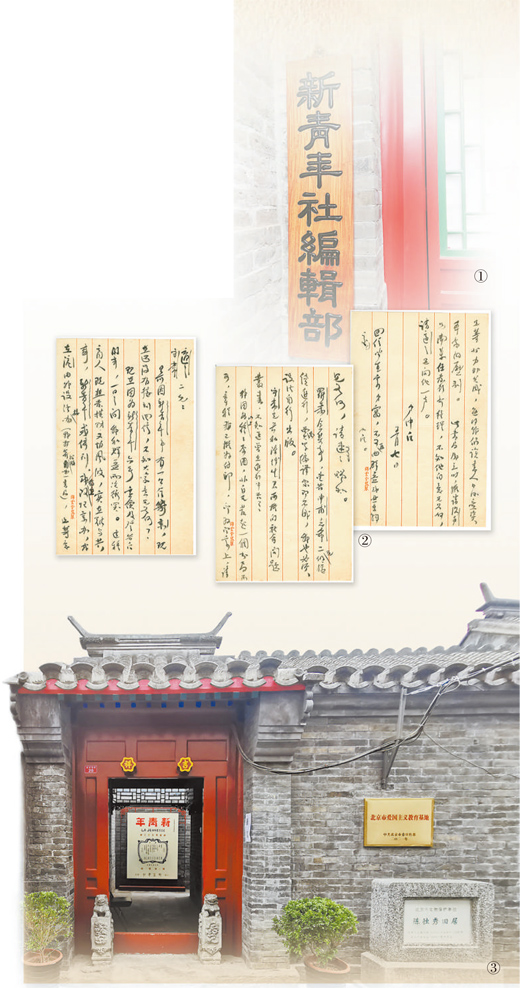 圖①:北京《新青年》編輯部辦公室;圖②:1920年5月7日陳獨秀致李大釗、胡適的信;圖③:北京《新青年》編輯部舊址大門。朱悅?cè)A、張丁供圖