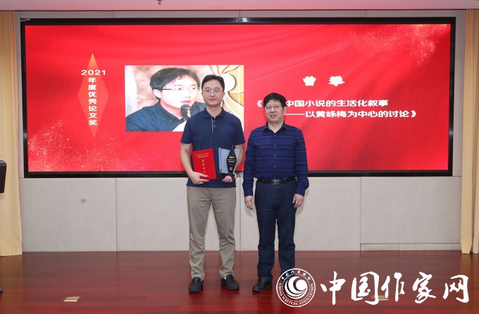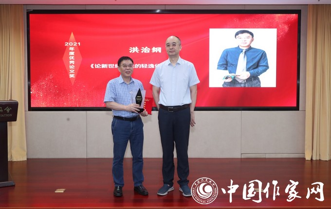 吳義勤為洪治綱頒發(fā)獲獎(jiǎng)證書及獎(jiǎng)杯