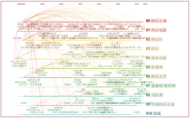 基于關鍵詞的共現(xiàn)強度,本課題團隊通過 CiteSpace的聚類功能,對2000—2020年的熱 點關鍵詞進行聚類,時間切片為1。“#”聚類 標簽通過LLR算法對文章關鍵詞智能計算完成。通過進一步整理分析共現(xiàn)聚類信息,本文將科幻研究概括為作家作品、影視產(chǎn)業(yè)、文藝理論、技術/社會等四個方面的研究。