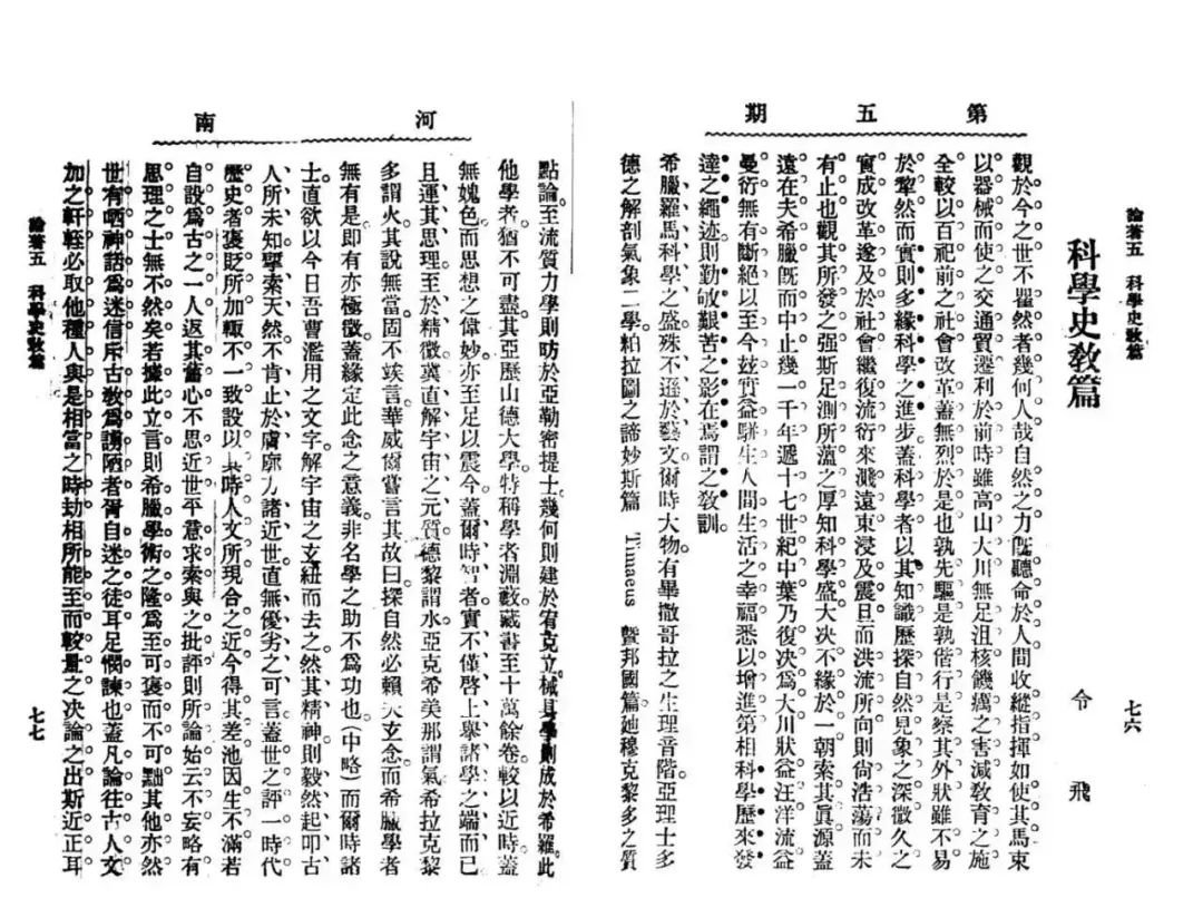 《科學(xué)史教篇》初發(fā)表于一九○八年六月《河南》月刊第五號(hào),署名令飛。