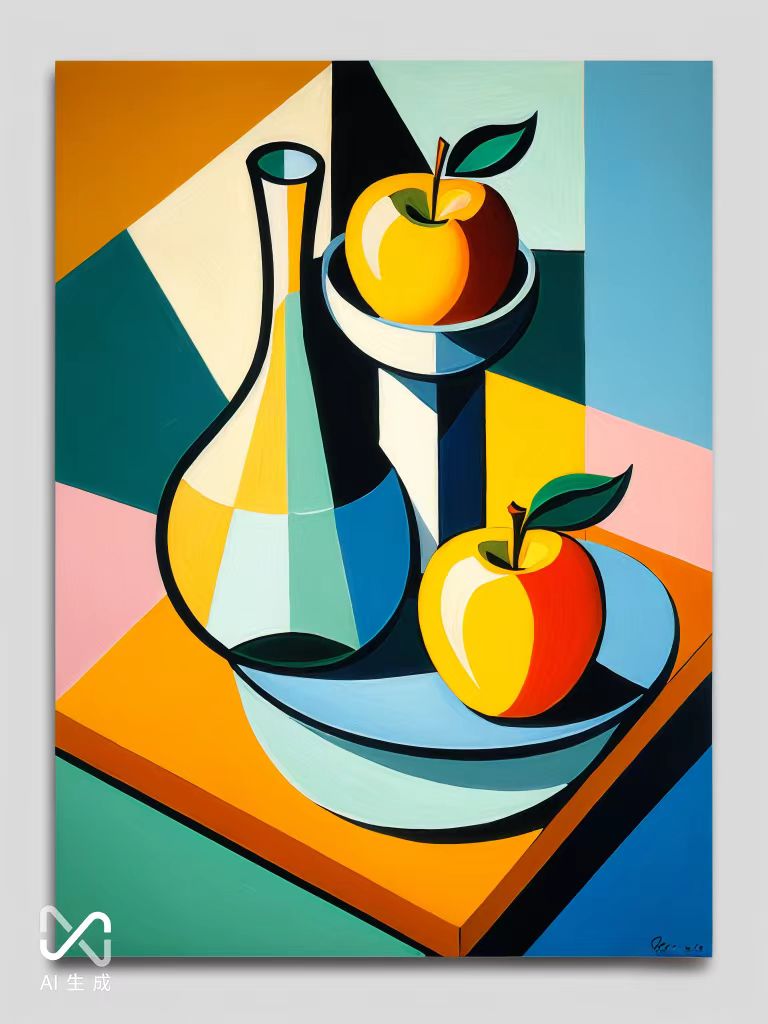 AI的立體主義風(fēng)格“蘋果”畫好啦,不得不說(shuō),蘋果仍然是我們熟悉的樣子,關(guān)鍵詞“抽象”并未得到準(zhǔn)確體現(xiàn)。