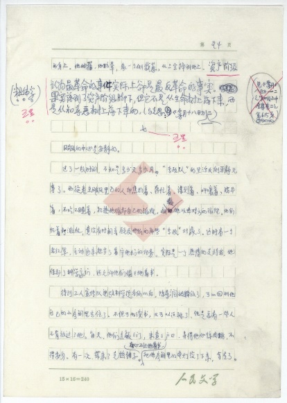 該稿共43頁,作者用藍(lán)黑墨水在“人民文學(xué)15X16=240”的稿紙上進(jìn)行創(chuàng)作。每張手稿右上角均有頁碼標(biāo)識,其中包括第1-37頁,第39-44頁。不知什么原因,該稿并沒有第38頁。經(jīng)筆者細(xì)讀,并與《人民文學(xué)》上發(fā)表的《哥德巴赫猜想》對照,發(fā)現(xiàn)該稿第37頁與第39頁的內(nèi)容前后連貫,很有可能是作者將第38頁錯(cuò)標(biāo)為第39頁。