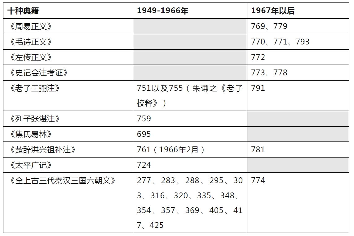 在提出新見(jiàn)解和對(duì)舊說(shuō)進(jìn)行增補(bǔ)訂正的過(guò)程中,錢(qián)鍾書(shū)逐漸產(chǎn)生了新的著述想法,就是指1972年3月他從河南干校返回北京后動(dòng)筆、1979年8月后陸續(xù)出版的《管錐編》這部龐大著作。從該書(shū)所涉及十種樞紐性質(zhì)的經(jīng)典看,《容安館札記》皆有其草稿,可以下表說(shuō)明: