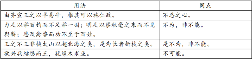 先看文章前部分,孟子為了建立起他立論的基礎(chǔ),認(rèn)為齊宣王行王道是不為而非不能,共有兩次比附。對(duì)此,解讀語(yǔ)文教科書(shū)課文的《教師教學(xué)用書(shū)》有一個(gè)分析,認(rèn)為: