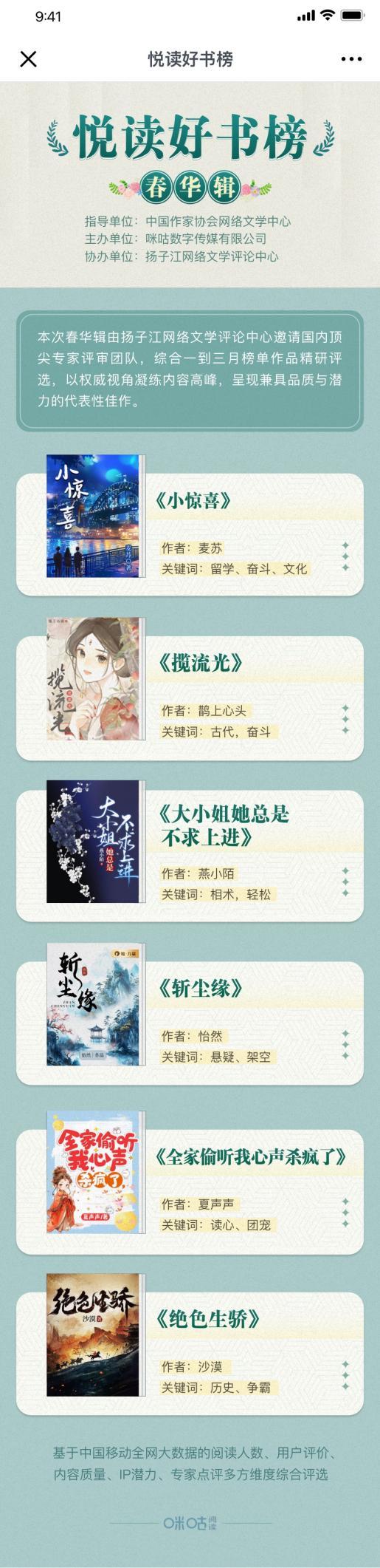 此次發(fā)布的“悅讀好書榜·春華輯”作為季度精選輯,基于中國移動大數(shù)據(jù)的初步篩選,由揚子江網(wǎng)絡(luò)文學(xué)評論中心邀請的國內(nèi)頂尖專家評審團隊對第一季度上榜作品綜合評估,精研評選出6部兼具品質(zhì)與潛力的代表性作品。