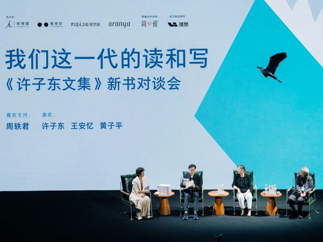 在《許子?xùn)|文集》新書對(duì)談會(huì)上,許子?xùn)|(左二)與王安憶(右二)、黃子平(右一)出席,周軼君擔(dān)任主持人。(圖/理想國(guó) 提供)