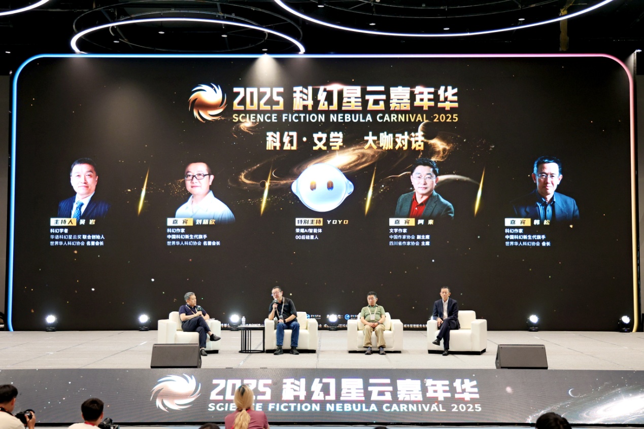 9月20日下午,本次嘉年華的重要活動(dòng)——“科幻·文學(xué)大咖對(duì)話(huà)”在成都科幻館舉行。中國(guó)作協(xié)副主席、四川省作協(xié)主席、茅盾文學(xué)獎(jiǎng)獲得者阿來(lái),科幻作家劉慈欣、韓松,圍繞“人工智能與科幻未來(lái)的交融與想象”展開(kāi)對(duì)談?;顒?dòng)由南方科技大學(xué)教授、華語(yǔ)科幻星云獎(jiǎng)聯(lián)合創(chuàng)始人吳巖主持。值得一提的是,本次活動(dòng)上,還有一位神秘嘉賓“OO后硅星人”——榮耀AI智能體YOYO,為大會(huì)增添了科幻色彩。