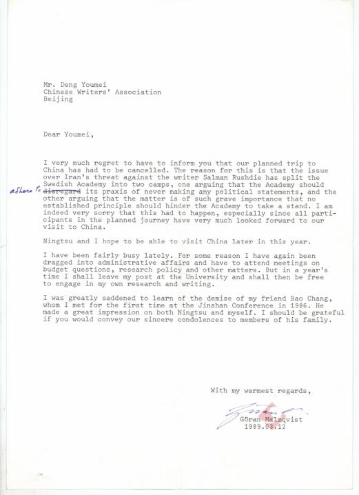 正如習(xí)近平總書記所言,漢學(xué)家是融通中外文明的使者。瑞典漢學(xué)家馬悅?cè)坏氖讉€(gè)中文名字取為“馬可漢”,“漢”字既有追隨其老師高本漢之意,也是“馬可汗”的演繹。1948年,馬悅?cè)粊?lái)到中國(guó)四川做方言調(diào)查,華西協(xié)合大學(xué)聞宥教授根據(jù)其本名G?ran 為其更名“悅?cè)弧?。他系統(tǒng)譯介了從先秦到當(dāng)代的中國(guó)文學(xué)作品,是首位將《水滸傳》《西游記》等名著譯為瑞典文的人。作為諾貝爾文學(xué)獎(jiǎng)評(píng)委會(huì)中精通中文的評(píng)委,他不懈地將沈從文、莫言等作家推向世界視野。文學(xué)館所藏其致鄧友梅的書信,正是這段漫長(zhǎng)而真摯的文學(xué)交流之路上一份溫暖的見證。